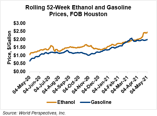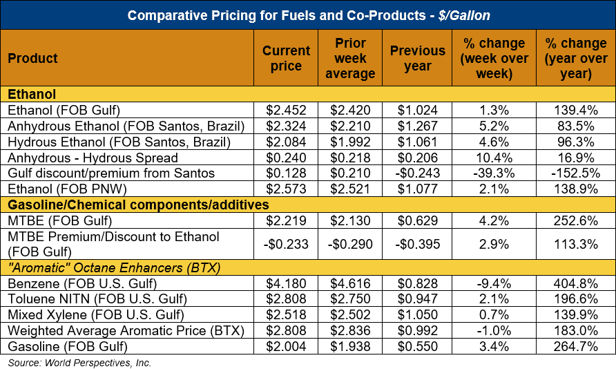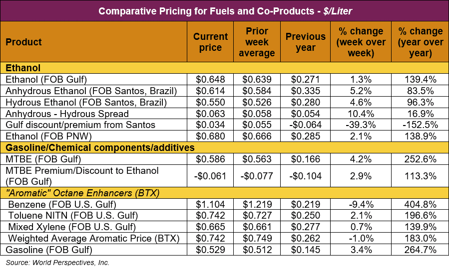 FOB Houston ethanol prices finished last week 6 percent higher and are up 1.3 percent through Tuesday’s trading from Friday’s close. FOB Houston ethanol prices are quoted at 64.76 cents/liter (245.15 cents/gallon). FOB Santos, Brazil anhydrous ethanol prices were higher last week; they are up in early week trading, rising 5.2 percent to 61.39 cents/liter (232.4 cents/gallon) through Tuesday’s trading.