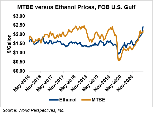 MTBE prices fell 0.5 percent last week but are sharply higher in early week trading, up 3.5 percent from Friday’s close through Tuesday’s trading. MTBE’s premium to FOB Houston ethanol has increased from last week’s report and stands at -6.5 cents/liter (-24.62 cents/gallon).