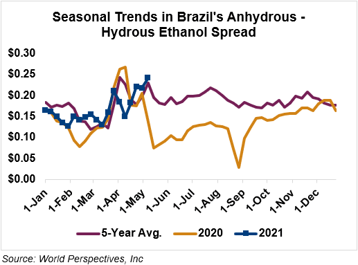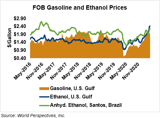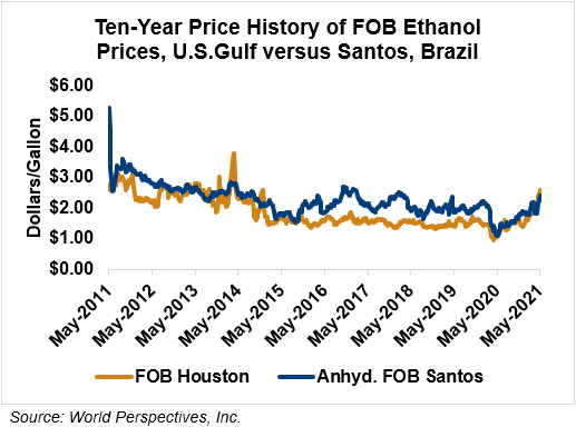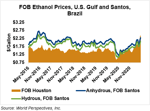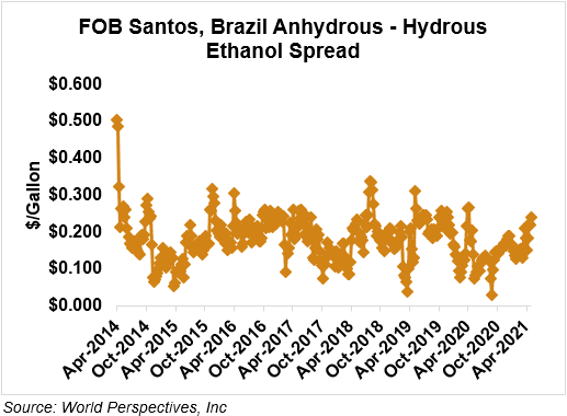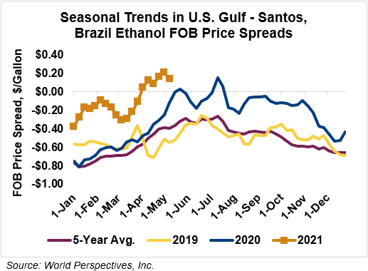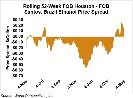 The FOB Gulf-Santos, Brazil ethanol spread has narrowed from last week’s close through Tuesday’s trading and is currently at 3.37 cents/liter (12.75 cents/gallon).