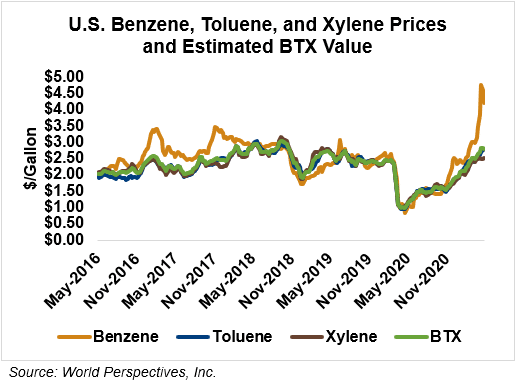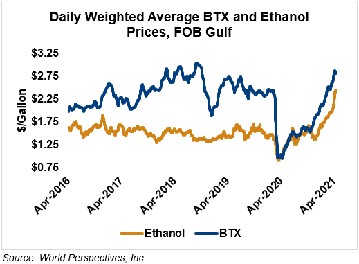 BTX component prices were mixed last week and are continuing that trend through Tuesday’s market close: Benzene is down 9 percent while Toluene is up 1.8 percent, and Xylene is up 0.6 percent. The estimated weighted average aromatic price is currently 74.17 cents/liter (280.77 cents/gallon), down from last Friday’s close. The BTX-Houston ethanol spread narrowed last week, and the weighted average BTX price is 9.41 cents/liter (35.62 cents/gallon) higher than the FOB Houston ethanol price.