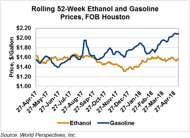 FOB Houston ethanol prices finished last week 2.2 percent lower and are taking back some of those losses in early week trading. FOB Houston prices are up 1.0 percent from Friday at 41.013 cents/liter (155.25 cents/gallon), an increase of 0.394 cents/liter (1.49 cents/gallon).