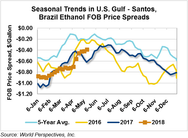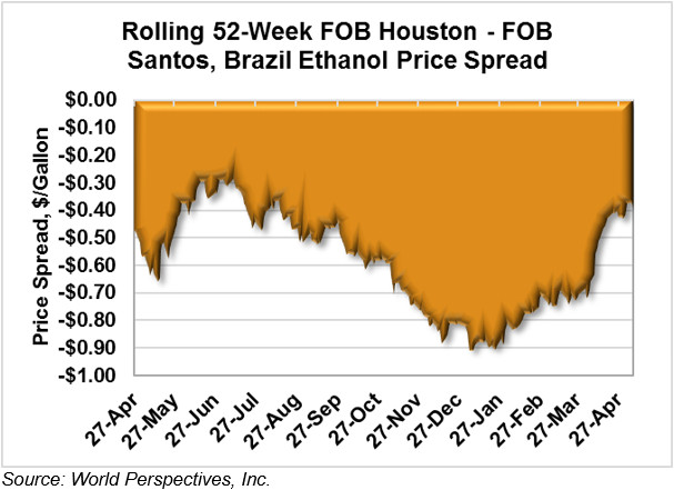 Lower FOB Gulf values and the continued weakness in Brazilian prices modestly narrowed the FOB Houston-Santos price spread last week. The spread fell 0.3 percent to -10.849 cents/liter (-41.070 cents/gallon) and is extending that trend this week. Prices show the spread narrowing 5.7 percent to -10.234 cents/liter (-37.740 cents/gallon).