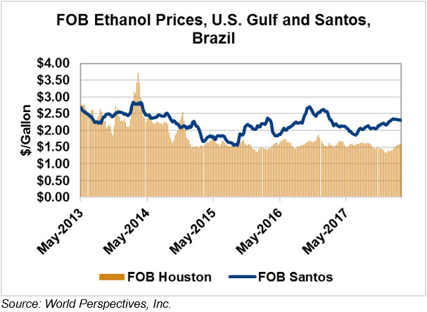 FOB Santos, Brazil ethanol prices continued their seasonal decline last week, falling 1.8 percent by Friday’s close. This week, prices are down 0.4 percent at 51.247 cents/liter (193.990 cents/gallon). As noted in last week’s report, FOB Santos ethanol prices have fallen in recent weeks as Brazilian ethanol mills are prioritizing ethanol production over sugar amid the sugar cane harvest season. However, stability is likely to return to the market as the seasonal downturn looks nearly finished.