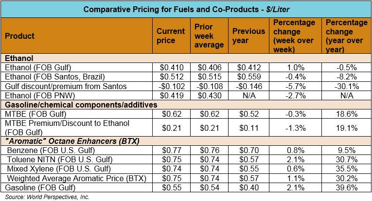 BTX component prices are higher to start the week, following last week’s mostly lower trade. Benzene prices finished last week down 1.5 percent and are up 0.8 percent so far this week. Toluene prices gained 0.5 percent last week and are 2.1 percent higher this week, while xylene prices fell 1.0 percent last week and are 0.6 percent higher this week. The estimated weighted average aromatic price is currently 74.75 cents/liter (282.95 cents/gallon), up 1.1 percent from Friday’s close. The weighted average BTX price is 33.735 cents/liter (127.70 cents/gallon) higher than FOB Houston ethanol prices.