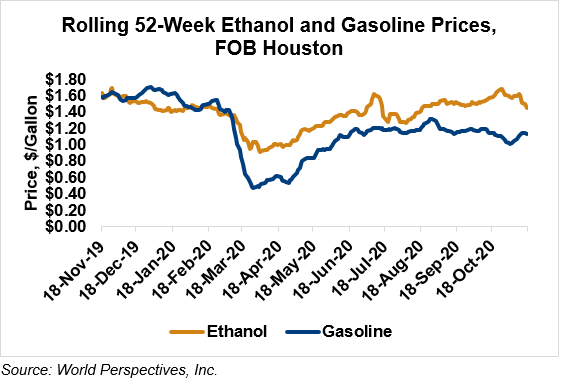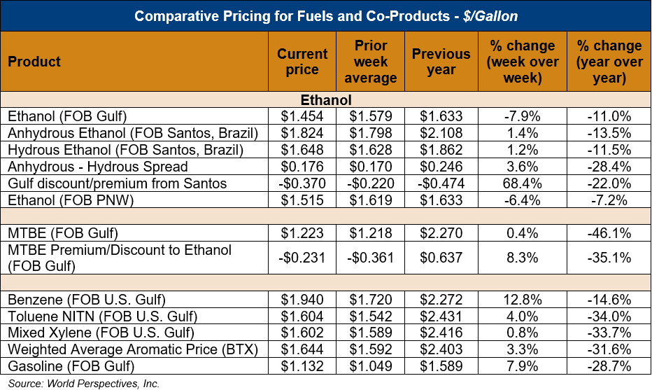 Market Outlook: U.S. ethanol prices ended last week 3.5 percent lower and are continuing that trend in early week trading, down 5 percent through Tuesday’s close. Midwest wholesale rack ethanol prices were lower to end last week and are down 2 percent through Tuesday’s market close to their last quote of 41.22 cents/liter (156.02 cents/gallon).