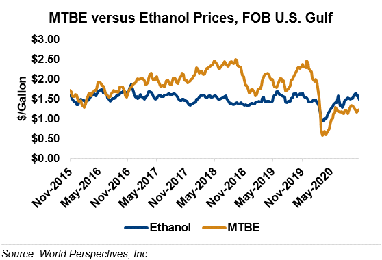 MTBE prices rose 4.4 percent last week and are extending those gains in early week trading, up 0.8 percent from Friday’s close through Tuesday’s trading. MTBE’s premium to FOB Houston ethanol has increased from last week’s report and stands at -5.98 cents/liter (-22.62 cents/gallon).