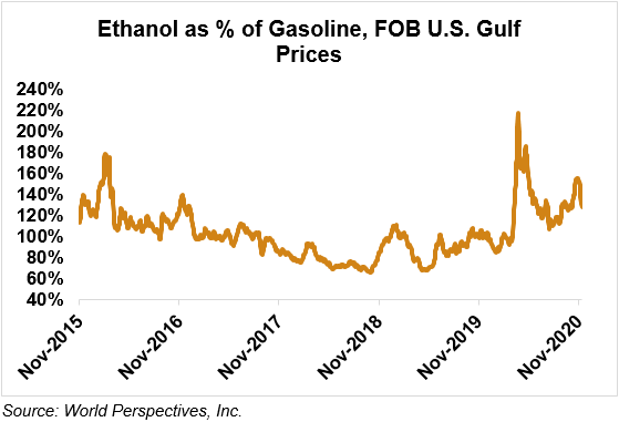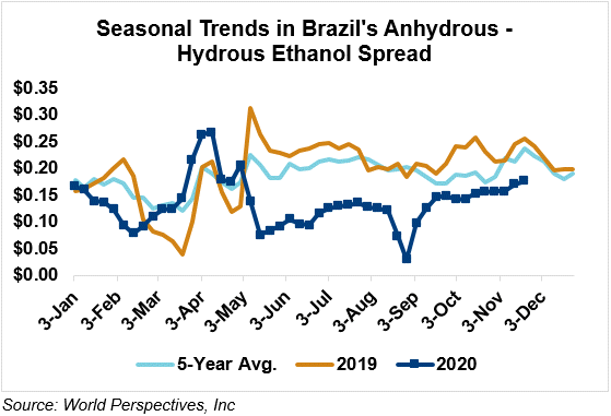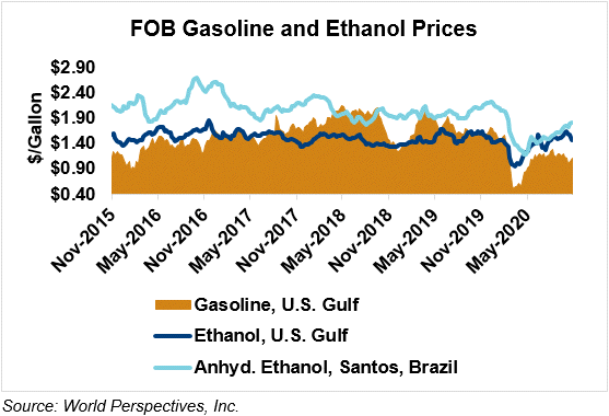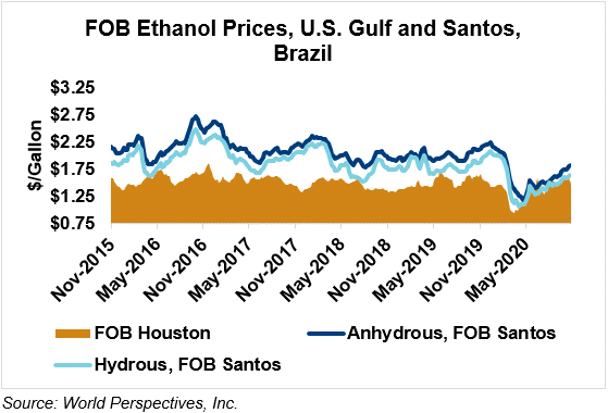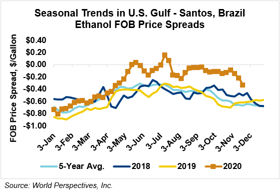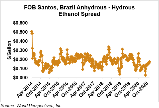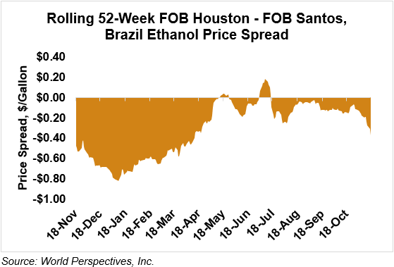 The FOB Gulf-Santos, Brazil ethanol spread has widened from last week’s close through Tuesday’s trading and is currently at -9.78 cents/liter (-37.01 cents/gallon).
