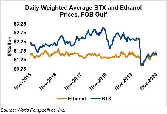 BTX component prices were sharply higher last week and are continuing that trend through Tuesday’s market close: Benzene is up 10.8 percent while Toluene is up 3.7 percent, and Xylene is up 1.2 percent. The estimated weighted average aromatic price is currently 43.39 cents/liter (164.23 cents/gallon), up from last Friday’s close. The BTX-Houston ethanol spread widened last week, and the weighted average BTX price is 4.98 cents/liter (18.85 cents/gallon) higher than the FOB Houston ethanol price.