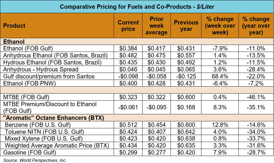 FOB Houston ethanol prices finished last week 0.5 percent lower and are down 7.9 percent through Tuesday’s trading from Friday’s close. FOB Houston ethanol prices are quoted at 38.41 cents/liter (145.39 cents/gallon). FOB Santos, Brazil anhydrous ethanol prices were higher last week; they are up in early week trading, rising 1.4 percent to 48.18 cents/liter (182.395 cents/gallon) through Tuesday’s trading.