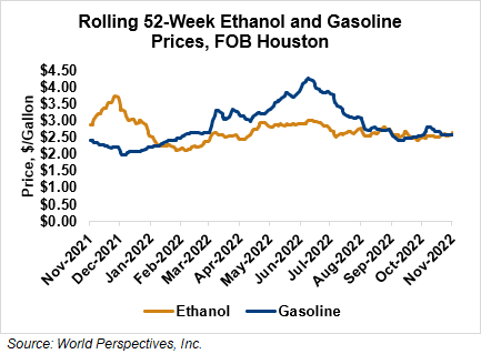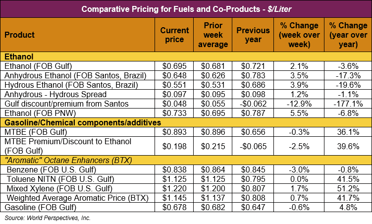 FOB Houston ethanol prices finished last week 1.2 percent lower but are up 3 percent through Tuesday’s trading from Friday’s close. FOB Houston ethanol prices are quoted at 69.55 cents/liter (263.27 cents/gallon). FOB Santos, Brazil anhydrous ethanol prices were lower last week; they are up in early week trading, rising 3.5 percent to 64.76 cents/liter (245.15 cents/gallon) through Tuesday’s trading.