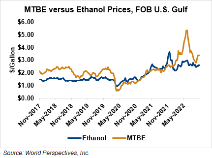 MTBE prices rose 0.3 percent last week but pared those gains in early week trading, falling 0.4 percent from Friday’s close through Tuesday’s trading. MTBE’s premium to FOB Houston ethanol has decreased from last week’s report and stands at 19.65 cents/liter (74.4 cents/gallon).
