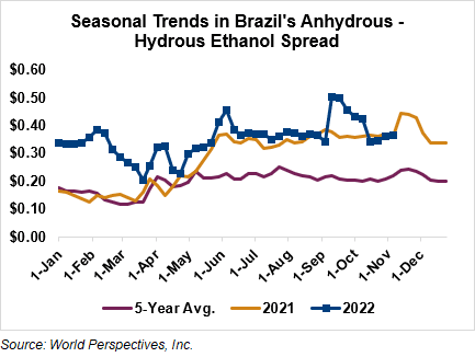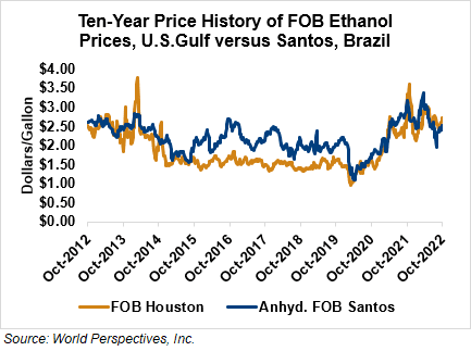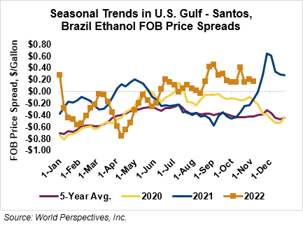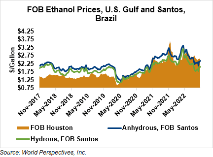 The FOB Gulf-Santos, Brazil ethanol spread has narrowed from last week’s close through Tuesday’s trading and is currently at 4.79 cents/liter (18.12 cents/gallon).