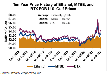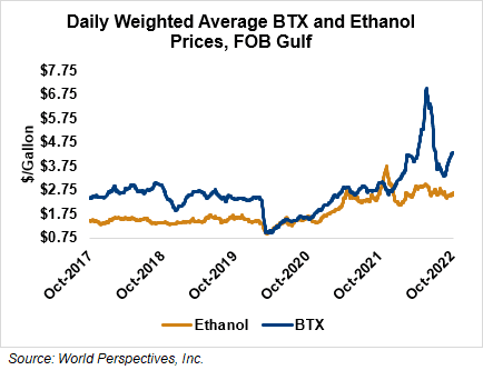 BTX component prices were higher last week but were softer through Tuesday’s market close: Benzene was down 2.7 percent while Toluene was unchanged, and Xylene was up 1.4 percent. The estimated weighted average aromatic price is currently 114.4 cents/liter (433.03 cents/gallon), up from last Friday’s close. The BTX-Houston ethanol spread narrowed last week, and the weighted average BTX price is 44.85 cents/liter (169.76 cents/gallon) higher than the FOB Houston ethanol price.