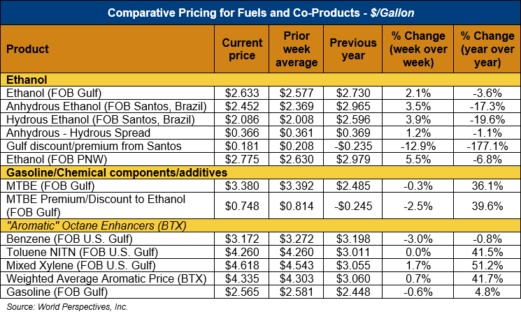 Market Outlook: U.S. ethanol prices ended last week 0.8 percent higher and rallied further in early week trading and rose 3.6 percent through Tuesday’s close. Midwest wholesale rack ethanol prices were lower to end last week but were up 1.5 percent through Tuesday’s market close to their last quote of 72.95 cents/liter (276.15 cents/gallon).