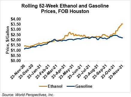 FOB Houston ethanol prices finished last week 7 percent higher at Friday’s close and are steady through Tuesday’s trading. FOB Houston ethanol prices are quoted at 93.36 cents/liter (353.4 cents/gallon). FOB Santos, Brazil anhydrous ethanol prices were lower last week; they are down in early week trading, falling 4.7 percent to 79.35 cents/liter (300.39 cents/gallon) through Tuesday’s trading.