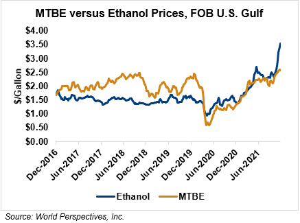 MTBE prices rose 2.2 percent last week but are weaker in early week trading, down 1.3 percent from Friday’s close through Tuesday’s trading. MTBE’s premium to FOB Houston ethanol has decreased from last week’s report and stands at -25.23 cents/liter (-95.51 cents/gallon).