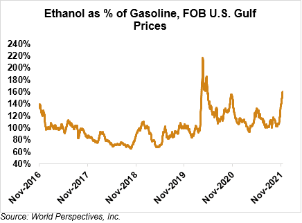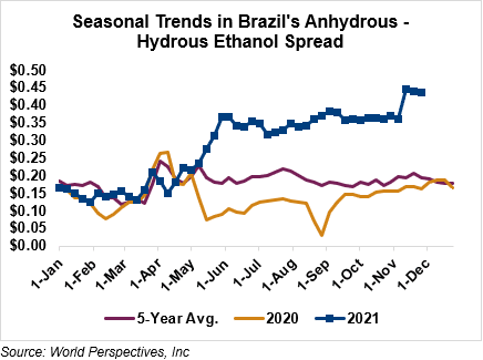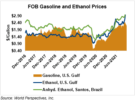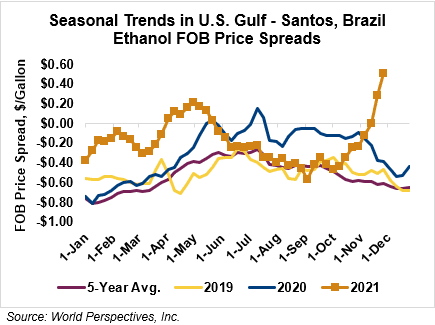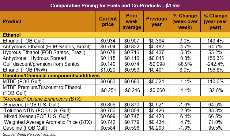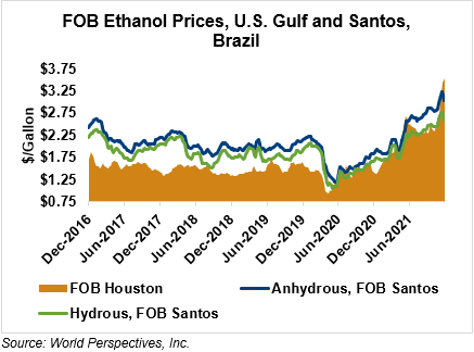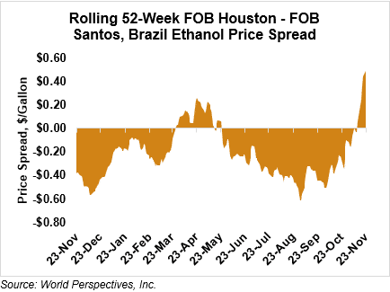 The FOB Gulf-Santos, Brazil ethanol spread has widened from last week’s close through Tuesday’s trading and is currently at 14 cents/liter (53.01 cents/gallon).