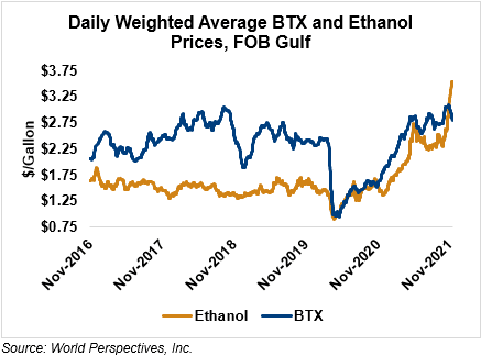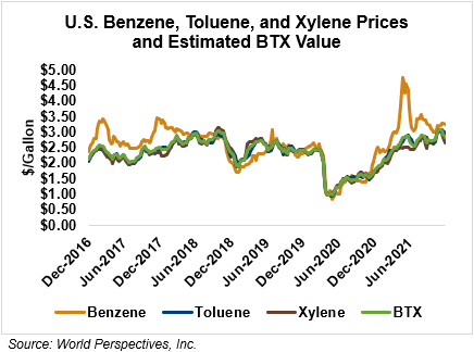 BTX component prices were mixed last week and have moved lower in early week trade: Benzene is down 1.5 percent while Toluene is down 2.4 percent, and Xylene is down 5.8 percent. The estimated weighted average aromatic price is currently 74.65 cents/liter (282.58 cents/gallon), down from last Friday’s close. The BTX-Houston ethanol spread narrowed last week, and the weighted average BTX price is -18.71 cents/liter (-70.82 cents/gallon) lower than the FOB Houston ethanol price.