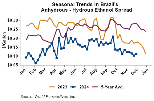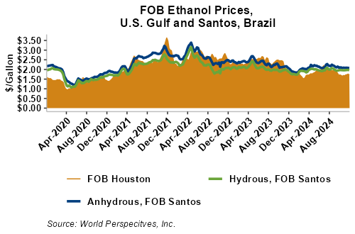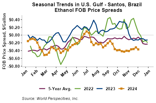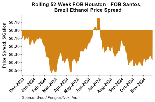The FOB Gulf-Santos, Brazil ethanol spread has widened from last week’s close through Tuesday’s trading and is currently at -9.88 cents/liter (-37.42 cents/gallon).