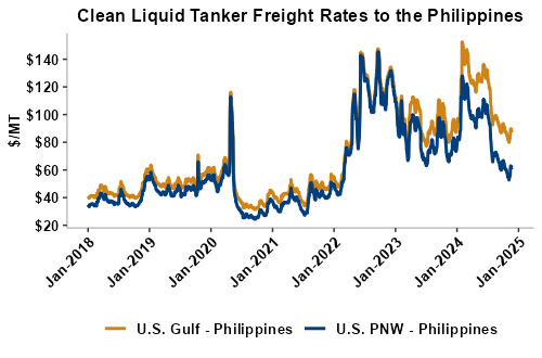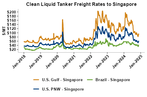 Liquid tanker rates largely unchanged this week with offers for the U.S. Gulf to the East Coast of Mexico seeing the largest gains (up 1 percent). Freight from the U.S. Gulf to the West Coast of Central America saw the largest declines and is down 0.1 percent from last week. On average, tanker freight from the U.S. Gulf and PNW are both unchanged this week. Liquid tanker freight rates from Brazil are also mostly steady this week as freight markets see the entrance of the typically slow holiday demand period. Freight rates across all origins are 24 percent lower than this same week in 2023.