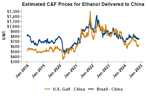 On a cost-and-freight (C&F) basis, offers are mostly lower this week as lower FOB offers for ethanol have offset steady prices in liquid tanker freight rates. Prices for ethanol C&F to Central America from the U.S. Gulf are down 3.4 percent this week and are down 18.8 percent from this same week in 2023. Values for PNW ethanol to Southeast Asia average $678.4/MT this week, down 3 percent from the prior week and down 12.8 percent year-over-year. That compares to U.S. Gulf to Southeast Asia C&F prices that average $652.6/MT and are down 3.2 percent from last week and are down 13.6 percent year-over-year. C&F prices for Brazilian ethanol to Southeast Asia are down 0.8 percent from last week.