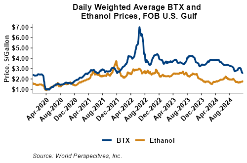 BTX component prices were sharply lower last week and continued that trend through Tuesday’s market close: Benzene was down 1.7 percent while Toluene was down 0.4 percent, and Xylene was up 2 percent. The estimated weighted average aromatic price is currently 68.76 cents/liter (260.27 cents/gallon), up from last Friday’s close. The BTX-Houston ethanol spread widened last week, and the weighted average BTX price is 23.9 cents/liter (90.45 cents/gallon) higher than the FOB Houston ethanol price.