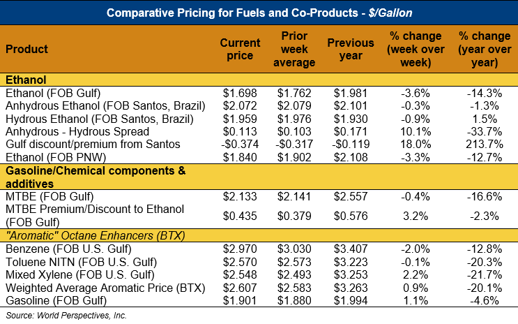 Market Outlook: U.S. ethanol prices ended last week 5.3 percent lower and continued that trend in early week trading to fall 1.2 percent through Tuesday’s close. Midwest wholesale rack ethanol prices were lower to end last week and were down 1.3 percent through Tuesday’s market close to their last quote of 46.23 cents/liter (175 cents/gallon).
