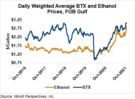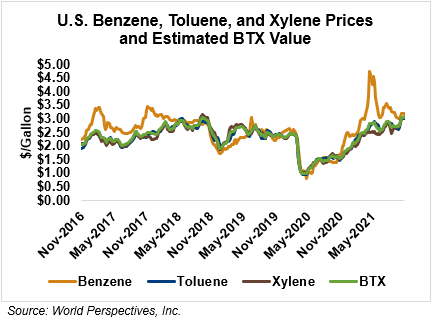 BTX component prices were mixed last week but are stronger through Tuesday’s market close: Benzene is up 0 percent while Toluene is up 0.7 percent, and Xylene is up 0.3 percent. The estimated weighted average aromatic price is currently 81.13 cents/liter (307.13 cents/gallon), up from last Friday’s close. The BTX-Houston ethanol spread narrowed last week, and the weighted average BTX price is 5.17 cents/liter (19.57 cents/gallon) higher than the FOB Houston ethanol price.