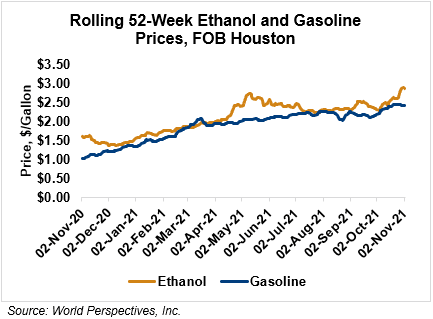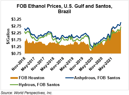 FOB Houston ethanol prices finished last week 4.9 percent higher and are up 5.3 percent through Tuesday’s trading from Friday’s close. FOB Houston ethanol prices are quoted at 75.97 cents/liter (287.56 cents/gallon). FOB Santos, Brazil anhydrous ethanol prices were higher last week; they are up in early week trading, rising 1.7 percent to 79.67 cents/liter (301.6 cents/gallon) through Tuesday’s close.