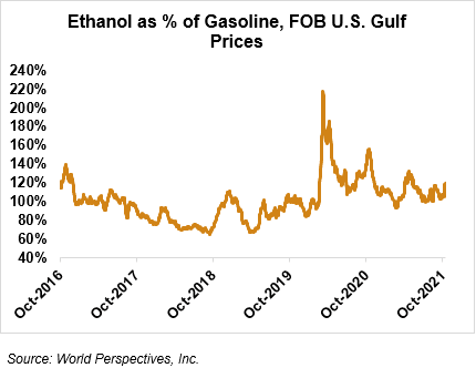 Market Outlook: U.S. ethanol prices ended last week 9.9 percent higher and are extending those gains in early week trading, up 1.7 percent through Tuesday’s close. Midwest wholesale rack ethanol prices were higher to end last week but are down 1.8 percent through Tuesday’s market close to their last quote of 79.21 cents/liter (299.86 cents/gallon).