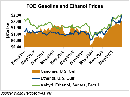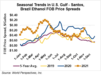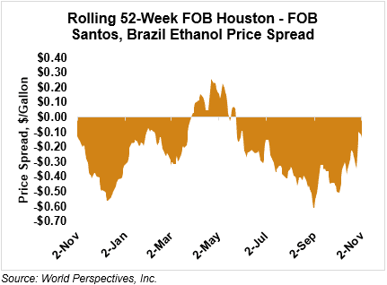 The FOB Gulf-Santos, Brazil ethanol spread has narrowed from last week’s close through Tuesday’s trading and is currently at -3.71 cents/liter (-14.04 cents/gallon).