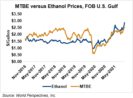 MTBE prices rose 1.5 percent last week but are slightly lower in early week trading, down 0.1 percent from Friday’s close through Tuesday’s trading. MTBE’s premium to FOB Houston ethanol has decreased from last week’s report and stands at -10.39 cents/liter (-39.34 cents/gallon).