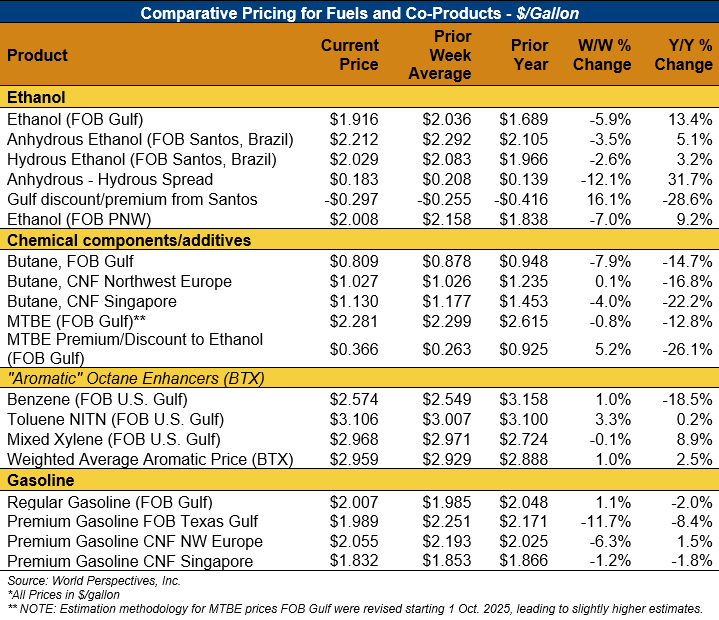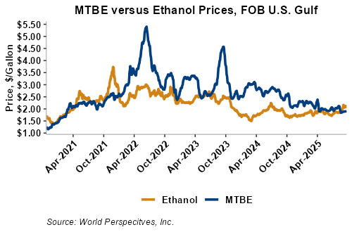 MTBE prices fell 0.2 percent last week and retreated further in early week trading to fall 0.8 percent from Friday’s close through Tuesday’s trading. MTBE’s premium to FOB Houston ethanol has decreased from last week’s report and stands at 9.62 cents/liter (36.43 cents/gallon).