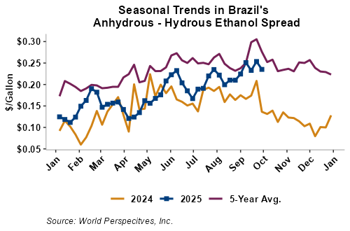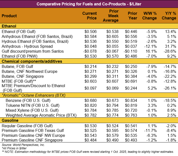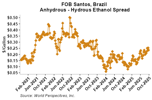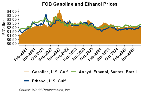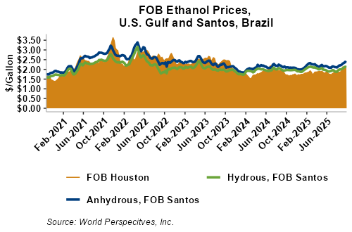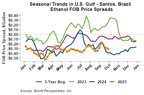 The FOB Gulf-Santos, Brazil ethanol spread has narrowed from last week’s close through Tuesday’s trading and is currently at -7.83 cents/liter (-29.65 cents/gallon).