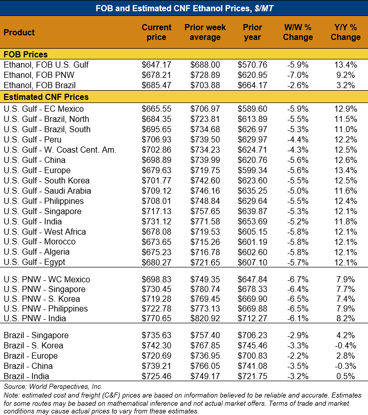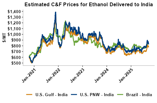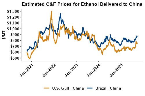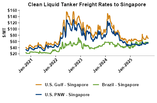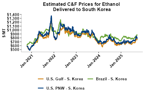 On a cost-and-freight (C&F) basis, offers are mostly lower this week as lower FOB offers for ethanol have offset gains in liquid tanker freight rates. Prices for ethanol C&F to Central America from the U.S. Gulf are down 4.8 percent this week and are up 12.5 percent from this same week in 2024. Values for PNW ethanol to Southeast Asia average $724.17/MT this week, down 6.5 percent from the prior week but up 7.7 percent year-over-year. That compares to U.S. Gulf to Southeast Asia C&F prices that average $708.97/MT and are down 5.4 percent from last week but are up 12.4 percent year-over-year. C&F prices for Brazilian ethanol to Southeast Asia are down 3 percent from last week.