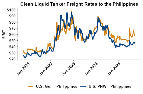 Liquid tanker rates are 0.1 percent higher on average this week with offers for the U.S. Gulf to the West Coast of Central America seeing the largest gains (up 20 percent). Freight from Brazil to China saw the largest declines and is down 14 percent from last week. On average, tanker freight from the U.S. Gulf is up 4 percent this week while freight from the PNW has posted a 1 percent increase. Liquid tanker freight rates from Brazil are down 7 percent, on average, this week. Freight rates across all origins are 7 percent lower than this same week in 2024.
