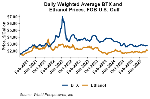 BTX component prices were mixed last week but had a firmer tone through Tuesday’s market close: Benzene was up 0.9 percent while Toluene was up 2.9 percent, and Xylene was down 0.1 percent. The estimated weighted average aromatic price is currently 78.08 cents/liter (295.56 cents/gallon), up from last Friday’s close. The BTX-Houston ethanol spread widened last week, and the weighted average BTX price is 27.47 cents/liter (104 cents/gallon) higher than the FOB Houston ethanol price.