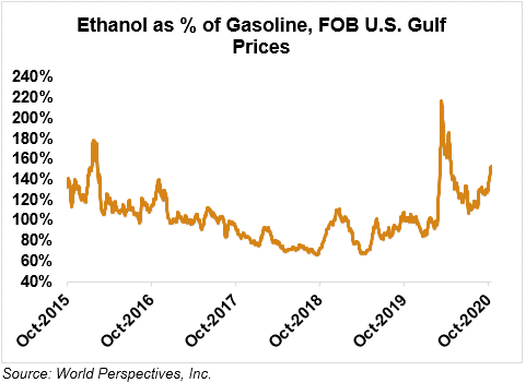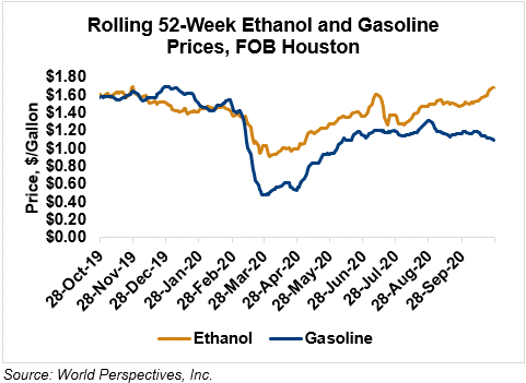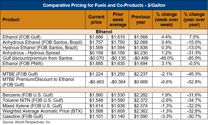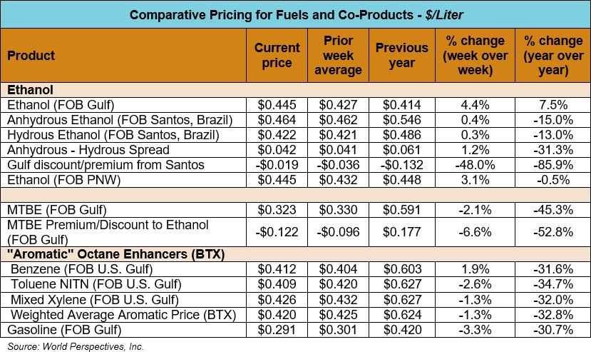 Market Outlook: U.S. ethanol prices ended last week 4.4 percent higher and are continuing that trend in early week trading, up 2.9 percent through Tuesday’s close. Midwest wholesale rack ethanol prices were higher to end last week and are up 2.7 percent through Tuesday’s market close to their last quote of 44.06 cents/liter (166.8 cents/gallon).