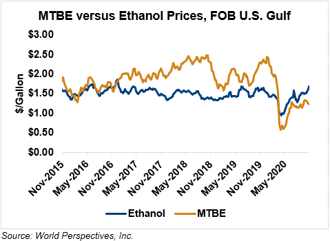 MTBE prices fell 3.6 percent last week and are extending those losses in early week trading, down 1.8 percent from Friday’s close through Tuesday’s trading. MTBE’s premium to FOB Houston ethanol has decreased from last week’s report and stands at -12.12 cents/liter (-45.89 cents/gallon).