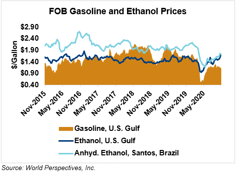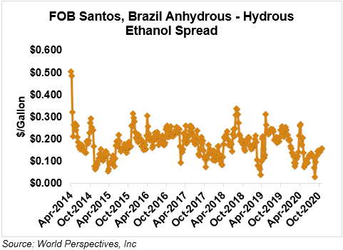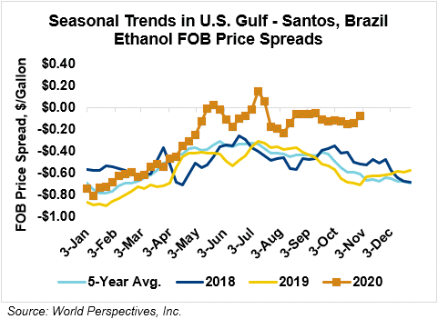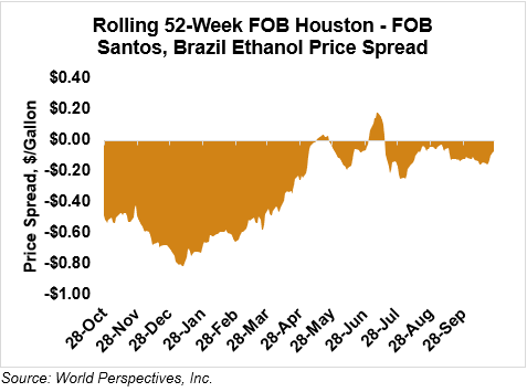 The FOB Gulf-Santos, Brazil ethanol spread has narrowed from last week’s close through Tuesday’s trading and is currently at -1.86 cents/liter (-7.02 cents/gallon).