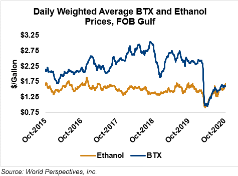 BTX component prices were mixed last week and are mixed through Tuesday’s market close: Benzene is up 2.4 percent while Toluene is down 2.4 percent, and Xylene is down 1 percent. The estimated weighted average aromatic price is currently 42.07 cents/liter (159.27 cents/gallon), down from last Friday’s close. The BTX-Houston ethanol spread narrowed last week, and the weighted average BTX price is -2.47 cents/liter (-9.37 cents/gallon) lower than the FOB Houston ethanol price.