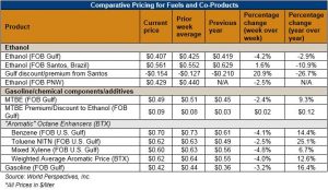 In Brazil, FOB Santos anhydrous ethanol prices are up 3.8 cents/gallon (1.004 cents/liter) following a three-week selloff. Lower gasoline prices have reduced consumption of hydrous ethanol (which competes against gasoline at the retail pump in Brazil) but have increased sales of anhydrous ethanol (which is blended with gasoline at the rate of 27 percent). Brazil’s increasing domestic consumption has consequently boosted the FOB prices of anhydrous ethanol. The price increase helped widen (as did lower FOB U.S. Gulf prices) the FOB Houston-Santos, Brazil ethanol price spread. The spread widened nearly 8 cents/gallon (2 cents/liter) to -56.75/gallon (-14.992/liter).
