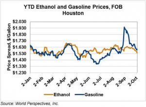 Market Outlook: U.S. ethanol markets are lower to start the week with few physical bids in the market. Traders are bearish with demand starting to turn down seasonally and production increasing following the fall ethanol plant maintenance shutdown season. Ethanol has suffered the same fate that befell the larger energy markets: a significant selloff to start the fourth quarter. The bearish activity is somewhat surprising given talk in the market about crude oil hitting $60/barrel in the very near future.