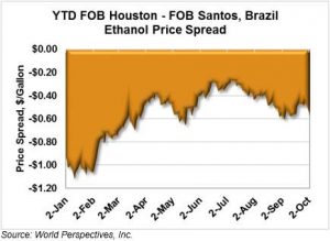 In Brazil, FOB Santos anhydrous ethanol prices are up 3.8 cents/gallon (1.004 cents/liter) following a three-week selloff. Lower gasoline prices have reduced consumption of hydrous ethanol (which competes against gasoline at the retail pump in Brazil) but have increased sales of anhydrous ethanol (which is blended with gasoline at the rate of 27 percent). Brazil’s increasing domestic consumption has consequently boosted the FOB prices of anhydrous ethanol. The price increase helped widen (as did lower FOB U.S. Gulf prices) the FOB Houston-Santos, Brazil ethanol price spread. The spread widened nearly 8 cents/gallon (2 cents/liter) to -56.75/gallon (-14.992/liter).
