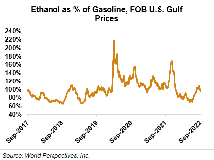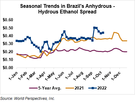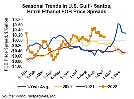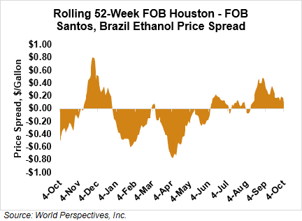 The FOB Gulf-Santos, Brazil ethanol spread has narrowed from last week’s close through Tuesday’s trading and is currently at 2.47 cents/liter (9.34 cents/gallon).