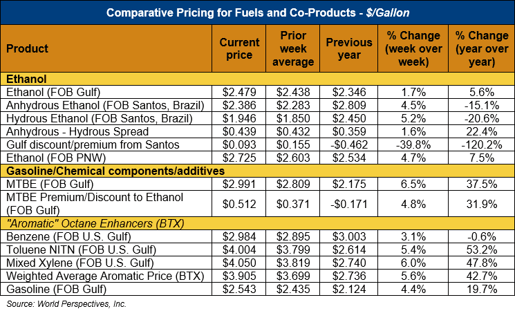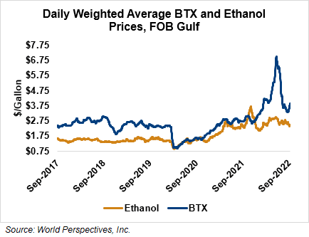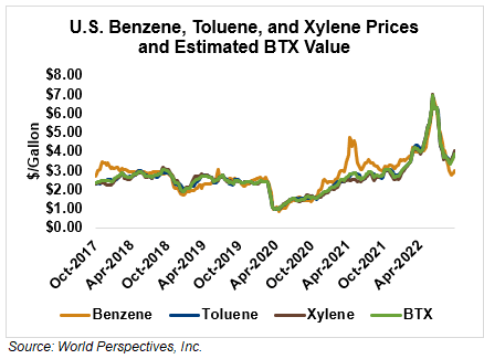BTX component prices were sharply higher last week and extended that rally through Tuesday’s market close: Benzene was up 2.9 percent while Toluene was up 4.9 percent, and Xylene was up 5.5 percent. The estimated weighted average aromatic price is currently 102.65 cents/liter (388.56 cents/gallon), up from last Friday’s close. The BTX-Houston ethanol spread widened last week, and the weighted average BTX price is 37.16 cents/liter (140.67 cents/gallon) higher than the FOB Houston ethanol price.