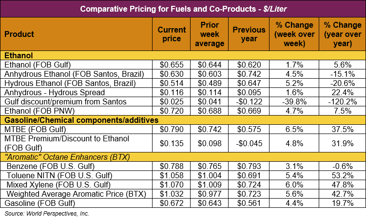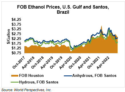 FOB Houston ethanol prices finished last week 0.8 percent higher but are down 0.7 percent through Tuesday’s trading from Friday’s close. FOB Houston ethanol prices are quoted at 65.48 cents/liter (247.89 cents/gallon). FOB Santos, Brazil anhydrous ethanol prices were lower last week; they are up in early week trading, rising 4.5 percent to 63.02 cents/liter (238.55 cents/gallon) through Tuesday’s trading.