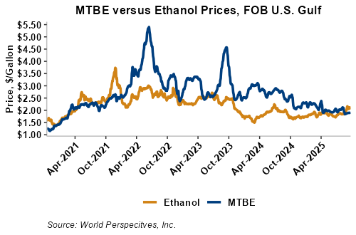 MTBE prices rose 3.9 percent last week but were steady in early week trading to gain 0.1 percent from Friday’s close through Tuesday’s trading. MTBE’s premium to FOB Houston ethanol has increased from last week’s report and stands at 5.77 cents/liter (21.84 cents/gallon).