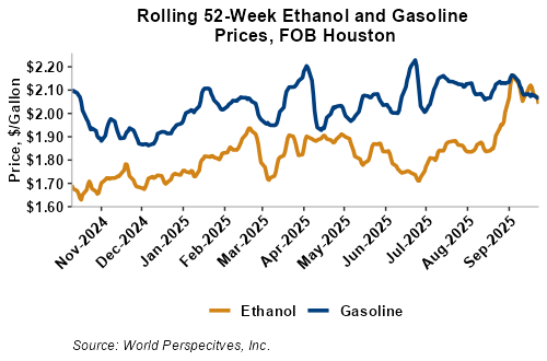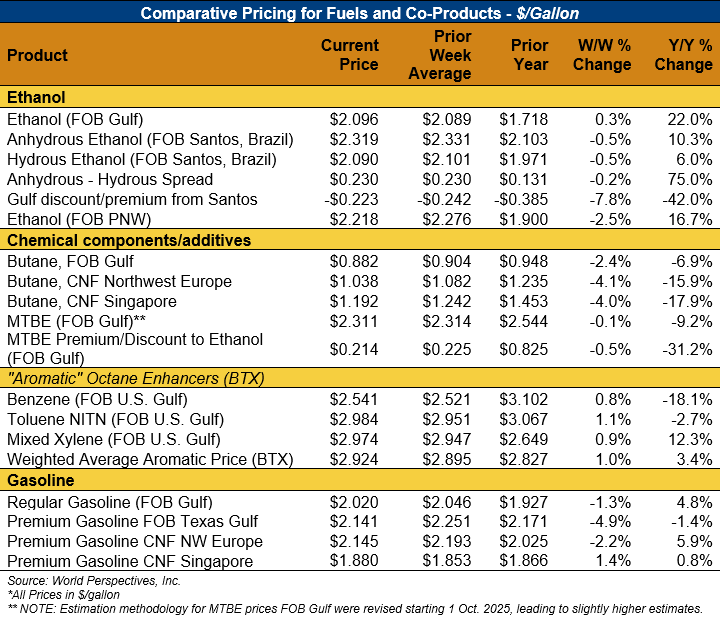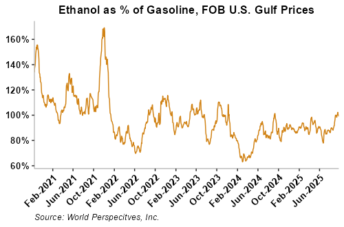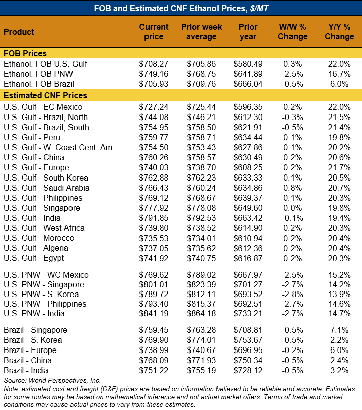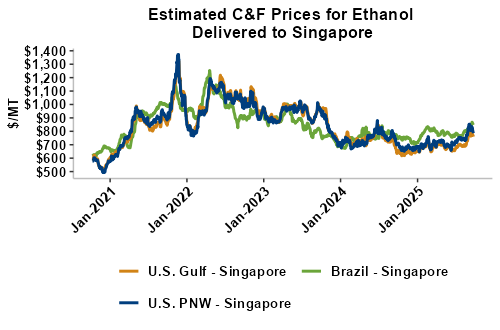 On a cost-and-freight (C&F) basis, offers are mixed this week as changes in freight rates and FOB ethanol offers have largely offset one another. Prices for ethanol C&F to Central America from the U.S. Gulf are up 0.2 percent this week and are up 20.6 percent from this same week in 2024. Values for PNW ethanol to Southeast Asia average $794.71/MT this week, down 2.7 percent from the prior week but up 14.2 percent year-over-year. That compares to U.S. Gulf to Southeast Asia C&F prices that average $769.97/MT and are up 0.1 percent from last week and are up 20.2 percent year-over-year. C&F prices for Brazilian ethanol to Southeast Asia are down 0.4 percent from last week.