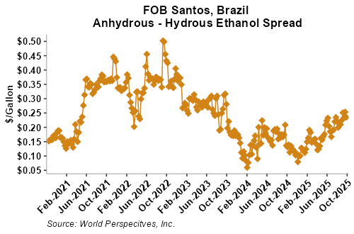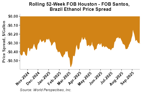The FOB Gulf-Santos, Brazil ethanol spread has widened from last week’s close through Tuesday’s trading and is currently at -5.89 cents/liter (-22.3 cents/gallon).